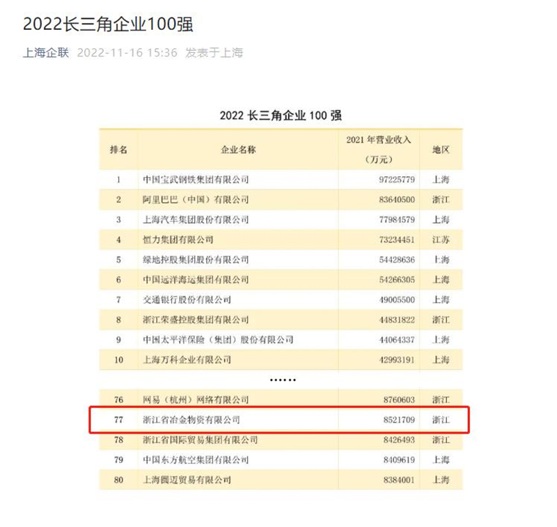 2022長(zhǎng)三角企業(yè)百?gòu)?qiáng)發(fā)布,本榜單中排名前三的企業(yè)分別是中國(guó)寶武鋼鐵集團(tuán)有限公司、阿里巴巴(中國(guó))有限公司、上海汽車集團(tuán)股份有限公司。浙江省冶金物資有限公司排名77位。